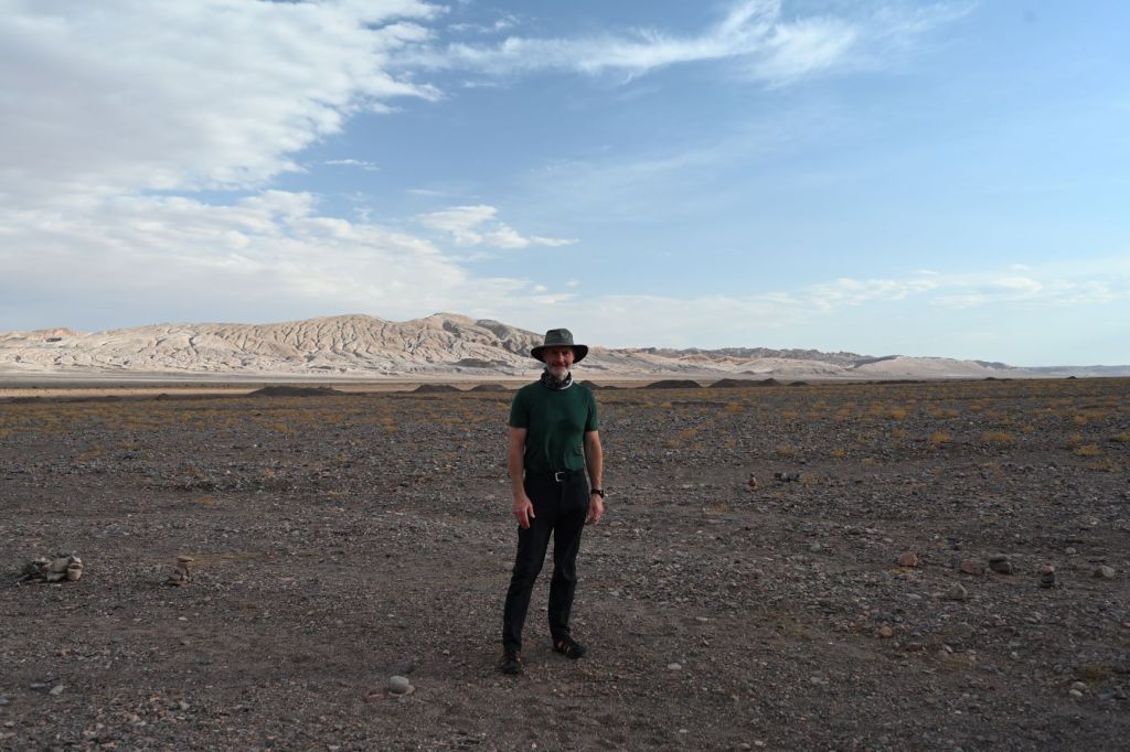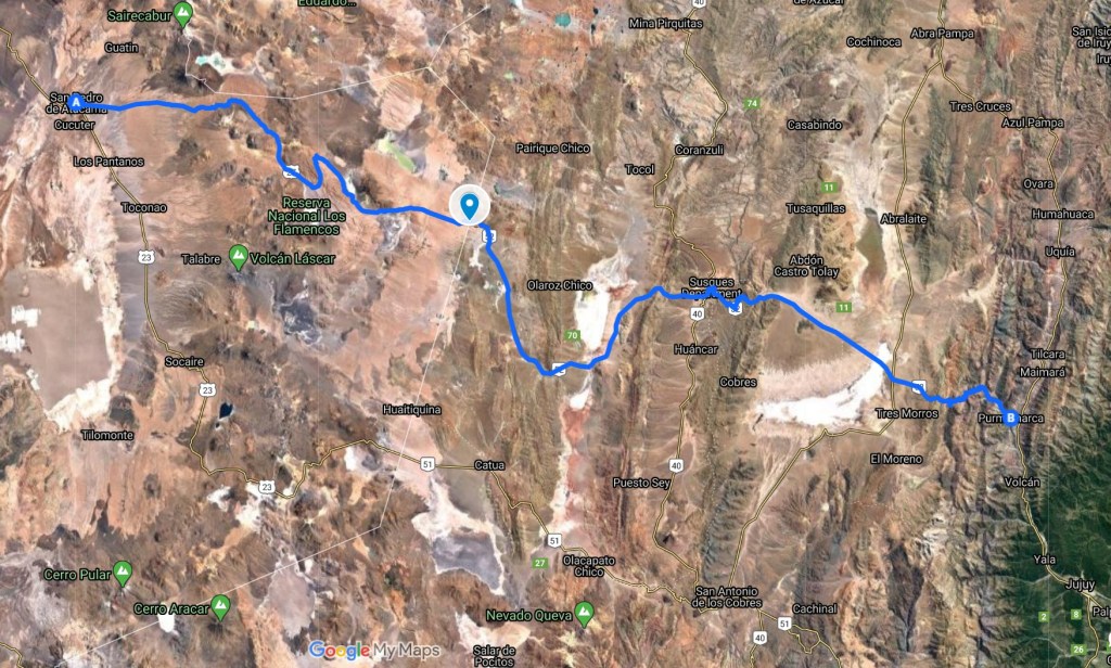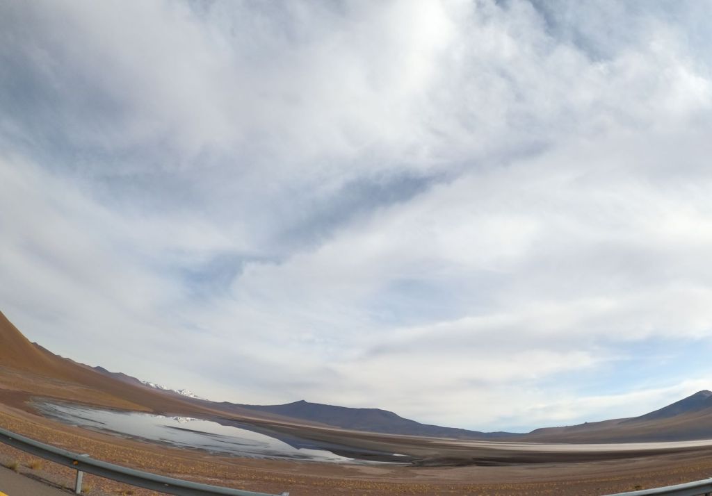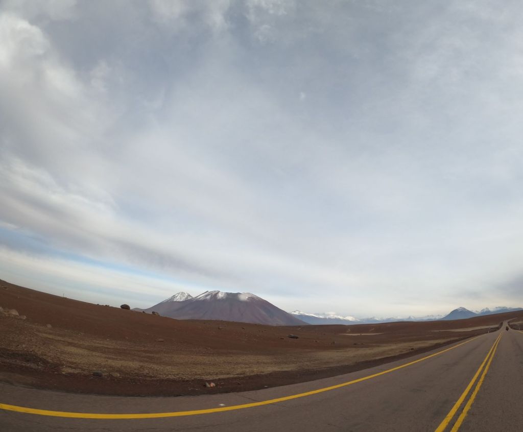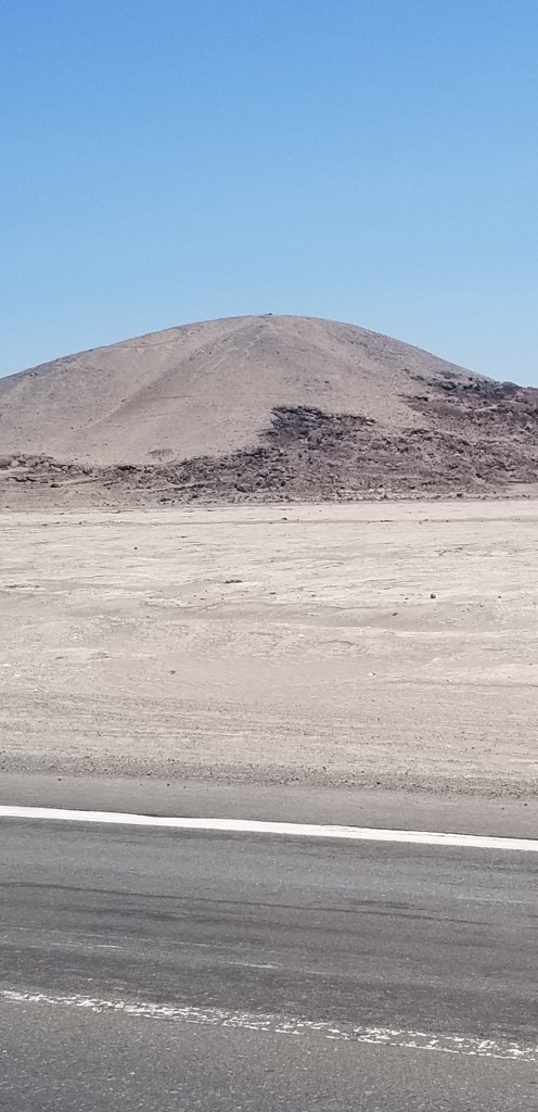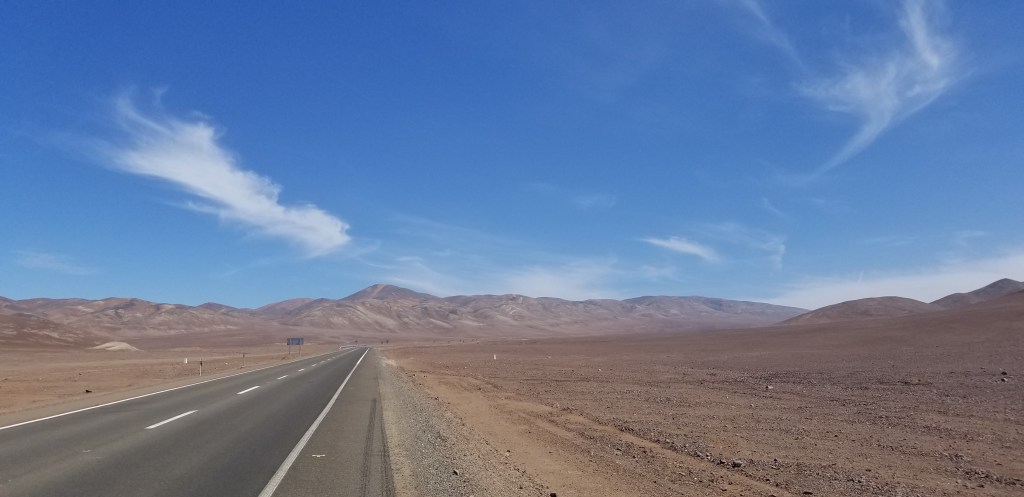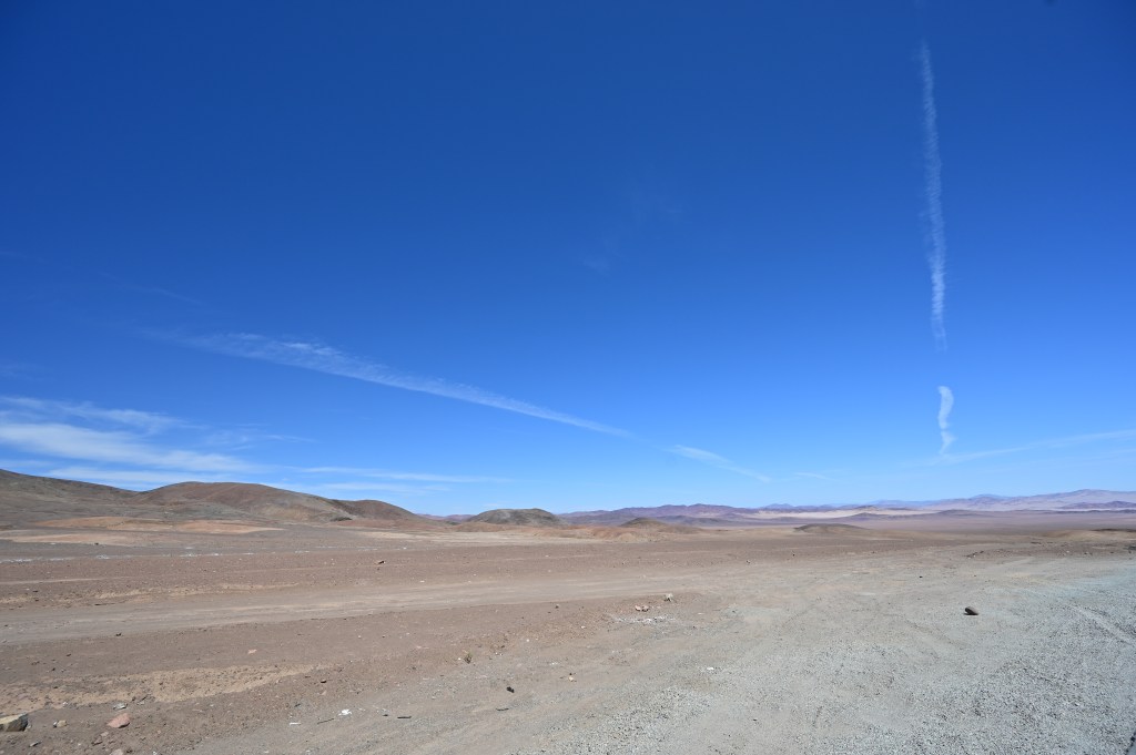 Left early out of Huasco and had a wonderful drive along the coast through National Llanos de Challe Park. Off to my left for hundreds of kilometers was breaking surf and to the right mountains dropping into the sea. The landscape then changed as I entered into the Atacama Desert. It is hard to describe the scale of the Atacama. My frame of reference is the steppes of Kazakhstan and Mongolia and this is very similar. Miles and miles of sand, rock, scrub, flatness interrupted by mountains and hills. Below iare two photos that attempts to capture this, but don’t really capture its scale.