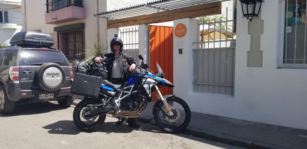 Day 1 – TOTAL MAYHEM. Getting used to the bike and understanding its balance points and limitations has been and continues to be a challenge. On the 12th, I was all over the place, stalling out repeatedly and a danger to everyone around me. I was scared and in over my head with the load I am carrying, particularly when I was trying to navigate to the hotel in Valparaiso, which is up on the side of hill…think of trying to get to the top of on of the hills in SF on a motorcycle and having to shift and stay on the road with about 100lbs of baggage on the bike. Because the experience was so new, everything was all moving very very fast and I was challenged processing all the new information. Luckily, I made it in one piece with only one fall (which I would characterize as minor given it was me not yet understanding the bike’s balance limits). THANK GOD!