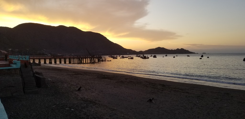 I pulled into a town called TalTal and stayed at a nice little hotel run by a very friendly husband and wife. They took good care of me. The town was less gritty than Huasco but still had its seedy side. Sunset below was beautiful.