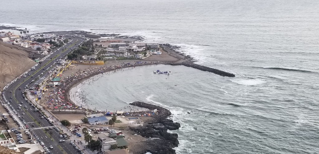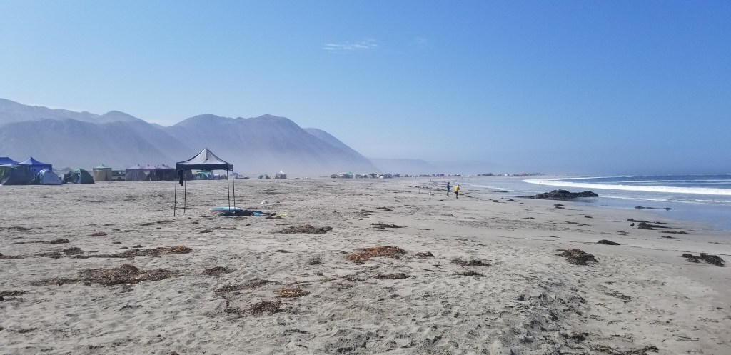 Got out of the hotel parking area without any incidents (celebrating the little victories) and headed out along the coast line. The ride was glorious…sunny, temp was good, beaches all along the way. The Chileans love to camp and many of the beaches have scenes like the one below. Extended families setting up camp on the beach and enjoying the summer…fishing, hanging out and partying.