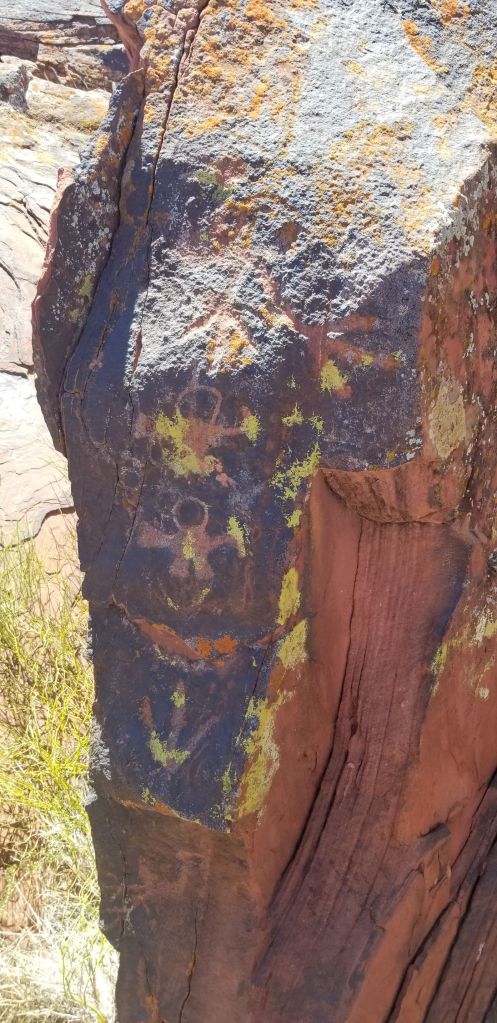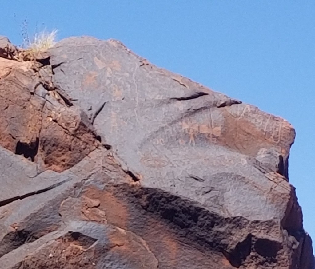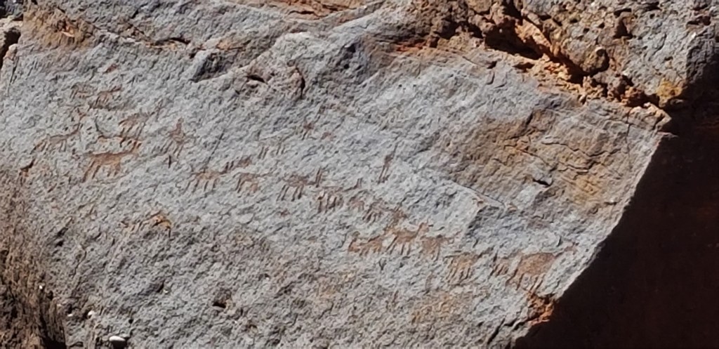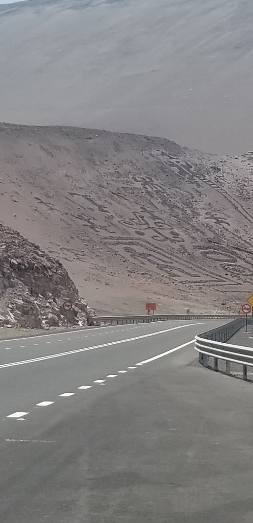 Alongside the road in a couple spots were ancient geoglyphs, which are prehistoric works of art placed on or worked into the landscape. They are found on hillsides and valley floors throughout the Atacama Desert, but they are always found near ancient pre-Hispanic trackways marking llama caravan routes through the difficult regions of the desert connecting the ancient people of South America. The oldest were created in the BC period and they are believed to have continued to be created into the 1500’s. Below you can see a couple pics I took of them. The first has a sun in the upper left and another image, I can’t make out. The second, speaks for itself. The hill it is on reaches about 500 feet into the air!