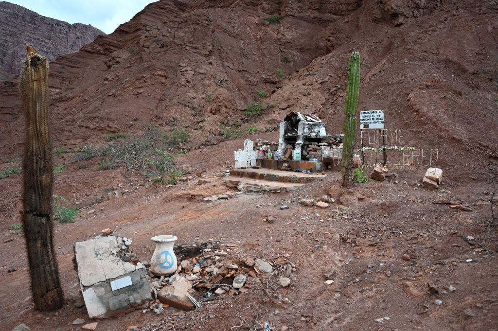 Throughout Chile and Argentina there are roadside shrines to those that have been killed at that spot on the road. They range from very small crosses to buildings constructed with bricks and blocks and whole cars encased in them. I thought the one below was interesting since it was so forlorn with empty Coke bottles and other assorted junk, dying cacti and the sign in the back which translates roughly to “drivers of salta tourist vehicles appreciate your protection.” Not sure if there is some irony being communicated there.