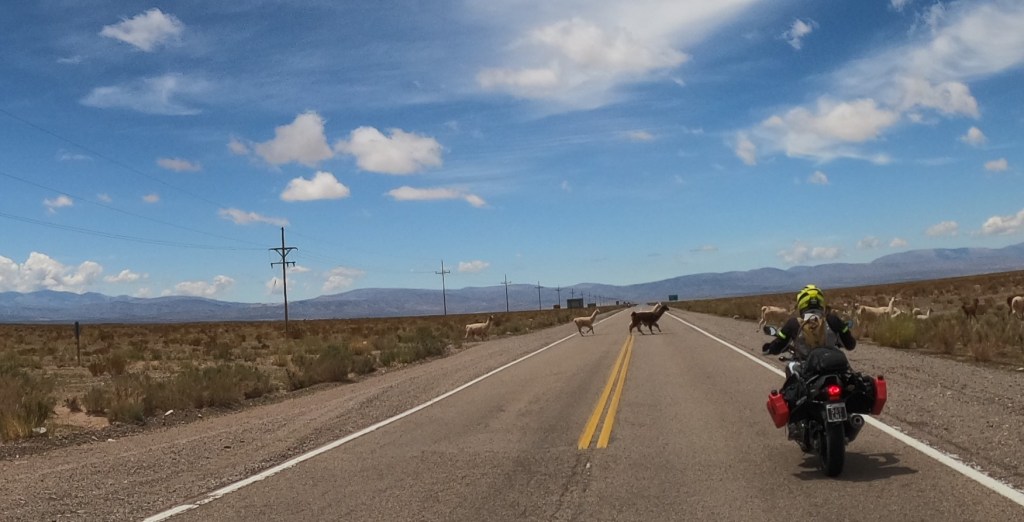 There were hundreds of guanacos along the road and in the surrounding countryside. Guanacos are dumber than a bag of hammers (attribution to Gary)…they have a habit of standing right off the side of the road and then suddenly darting out into the road when one is approaching. As a result, one must be very careful around them because the direction they choose to run could very well be in the path of the motorcycle, which I did see happen several times. To add an additional element of surprise, they are very well camouflaged, so they blend in extremely well with the environment. Suddenly, you can be on top of them and have to react. All of this can be a challenge when going 100k-150k per hour with limited visibility. I had a few close encounters, but nothing too frightening…I made it through my first day of riding in guanaco territory.