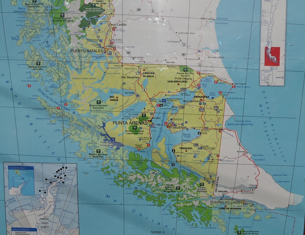 We then headed back to the open plains of Chile and south onto the island of Tierra del Fuego by crossing the Strait of Magellan by ferry. Below is a good map of the area which shows the Strait of Magellan. The Strait is an important passage between the Pacific and Atlantic. Ferdinand Magellan’s original name for the strait was Estrecho de Todos los Santos (“Strait of All Saints”). Charles V, the financier of the Magellan exploration, changed the name to Strait of Magellan to honor him. The route is difficult to navigate due to frequent narrows and unpredictable winds and currents. The strait is shorter and more sheltered than the Drake Passage, the often stormy open sea route around Cape Horn, which is beset by frequent gale-force winds and icebergs. Along with the Beagle Channel, the strait was one of the few sea routes between the Atlantic and Pacific before the construction of the Panama Canal.