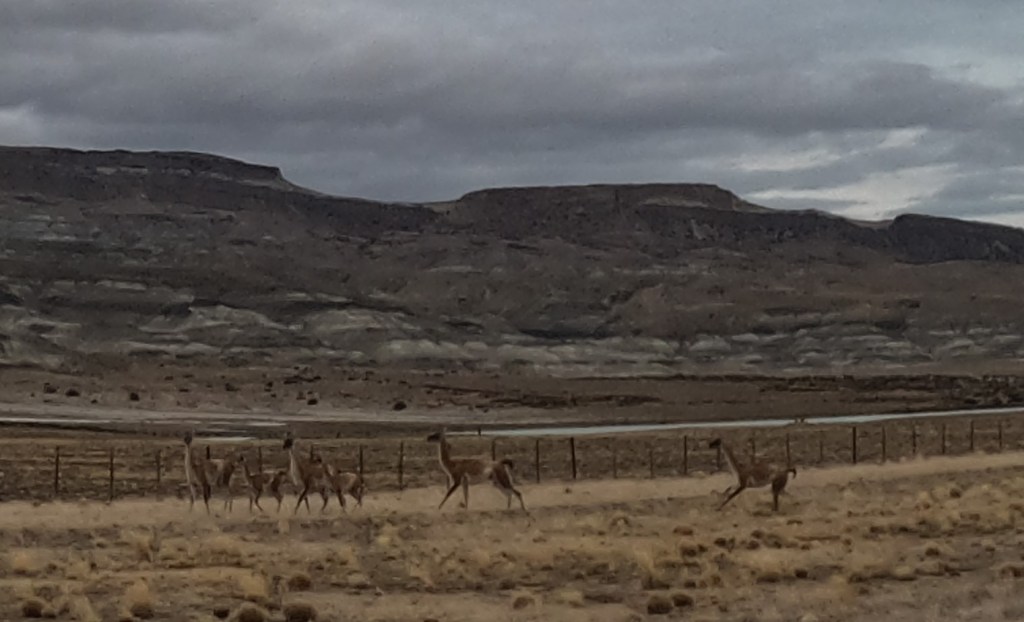 I had to leave the group early so that I could arrive in Gobernador Gregores for a six-hour phone call. I was on the road at 7:00 am, about an hour ahead of the group. The first 60k was due east and I was leaving at sunrise. It was about 45 degrees out and the sun was directly in front of me or just right or left. As a result, I was very cold and working with only 30%-50% visibility…very dangerous conditions. Further, I was entering guanacos territory. Guanacos are camelids, cousins of llamas and vicunas, that stand about five feet tall and are 200-300 pounds.