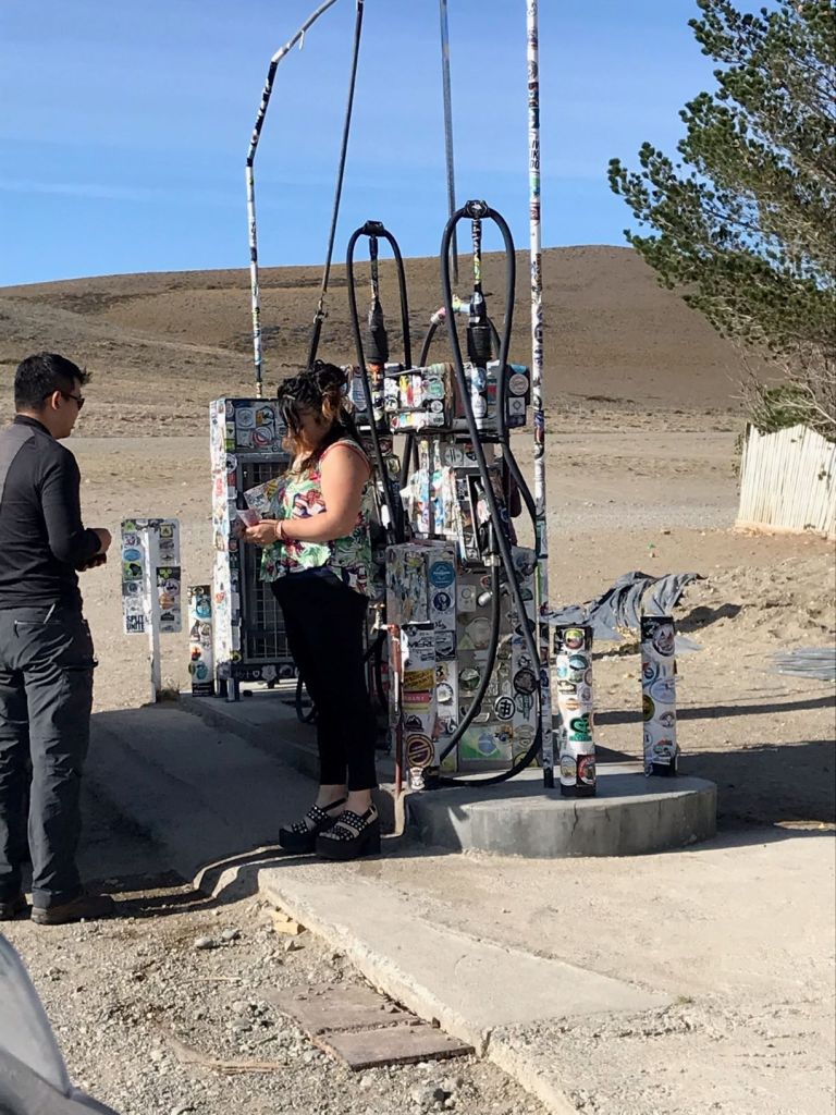 I had to stop for fuel in a very small hamlet of maybe 25 buildings called Bajo Caracoles. Bajo is definitely one of those strange little towns that crop up for some reason and becomes populated by loners, renegades and recluses. It sits literally in the middle of nowhere in an inhospitable environment…wind-blown, isolated and who knows why it is where it is. There is a doctor, lawyer, mechanic shop and a bodega with two gas pumps. It is a key location for motorcyclists because there isn’t fuel for many kilometers in any direction and one can’t make it on this section of Ruta 40 without gas from here or carrying external gas tanks. I have a two-gallon gas bag with me, filled up, but I still stopped to fill up my gas tank just in case. Below is a picture of the gas pumps with all the stickers from motorcyclists around the world that have passed through.